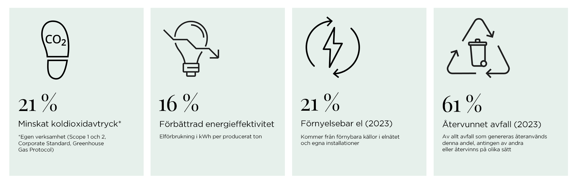 Energiförbrukningen är den faktor som bidrar mest till koldioxidavtrycket från vår produktion. Vi arbetar därför kontinuerligt med att öka vår energieffektivitet och andelen förnybar energi.