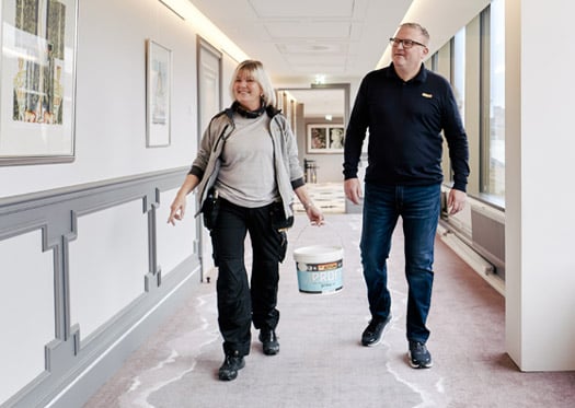 – Se, der har vi favorittmaleren min, utbryter hotelldirektør Mikael Forselius idet han får øye på Sissel Aune i hotellets konferanseavdeling Kongressen. Sissel jobber for Malermester Blakstad, som i 2019 fikk oppdraget for Britannia Hotel. Og fordi Malermester Blakstad har Jotun som sin samarbeidspartner, har Jotun siden den gang vært tett involvert i vedlikeholdet.